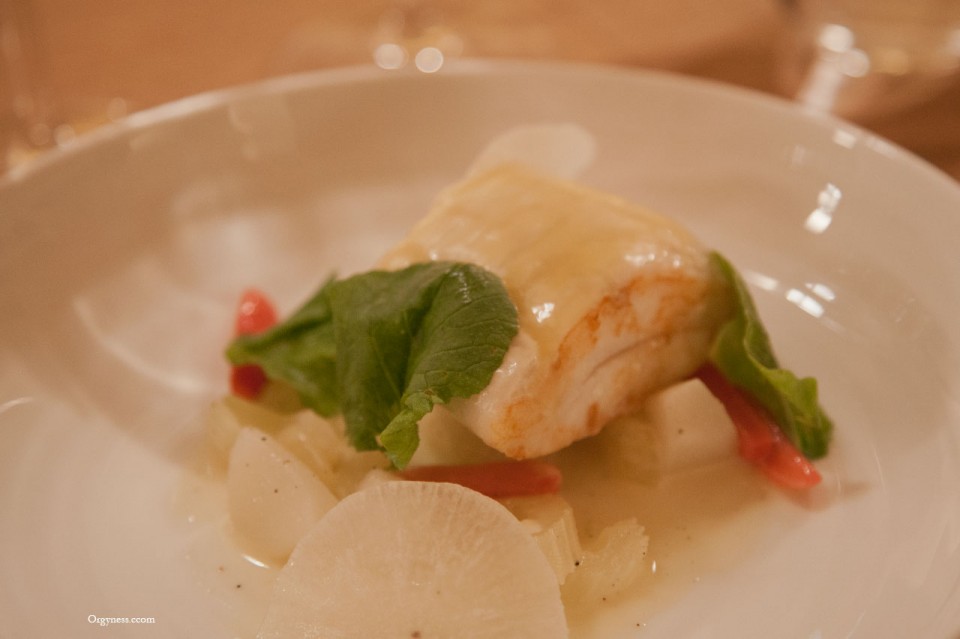 En effet, ça commence tout doucement avec le « Champignon de Paris, à Fontevraud », un assemblage de textures et de saveurs ne ramenant finalement qu’à un feuilleté au champignons déstructuré. Et si la « Langoustine, royale excentrique et coulis mélisse » qui suit surprend par la douceur réglissée de son accompagnement, elle ne sait contrôler les relents d’ail qui contaminent le reste de la soirée. Heureusement, le « Turbot laqué au miel de l’Abbaye » s’en sort bien mieux par la précision de la cuisson et sa jolie texture qui n’a pas eu le temps de se figer, mais la touche locale du miel paraît alors superflue. Pour finir, les « Fraises et rhubarbe semi-confite » promènent leur légèreté acidulée le long des palais des convives.